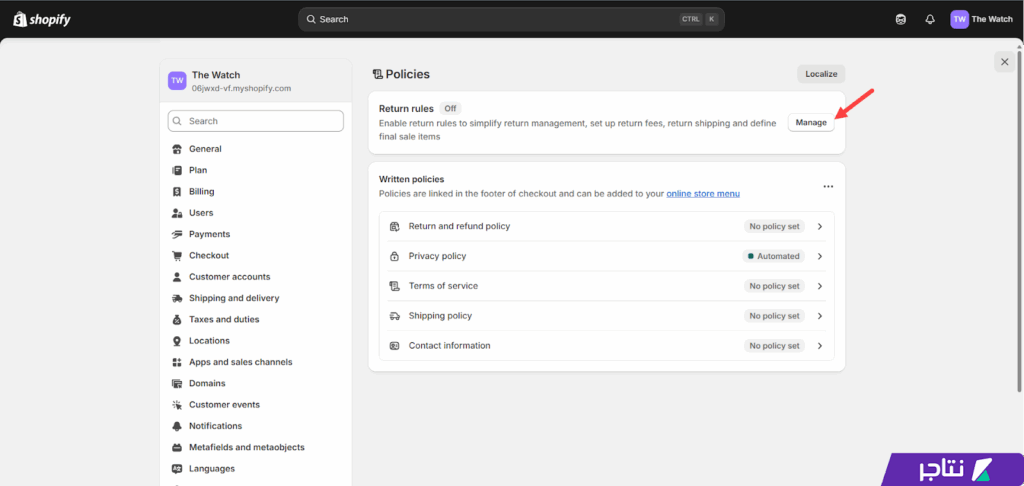 وللقيام بذلك، نضغط على زر "Manage" من قسم Return rules كما هو موضح في الصورة التالية: