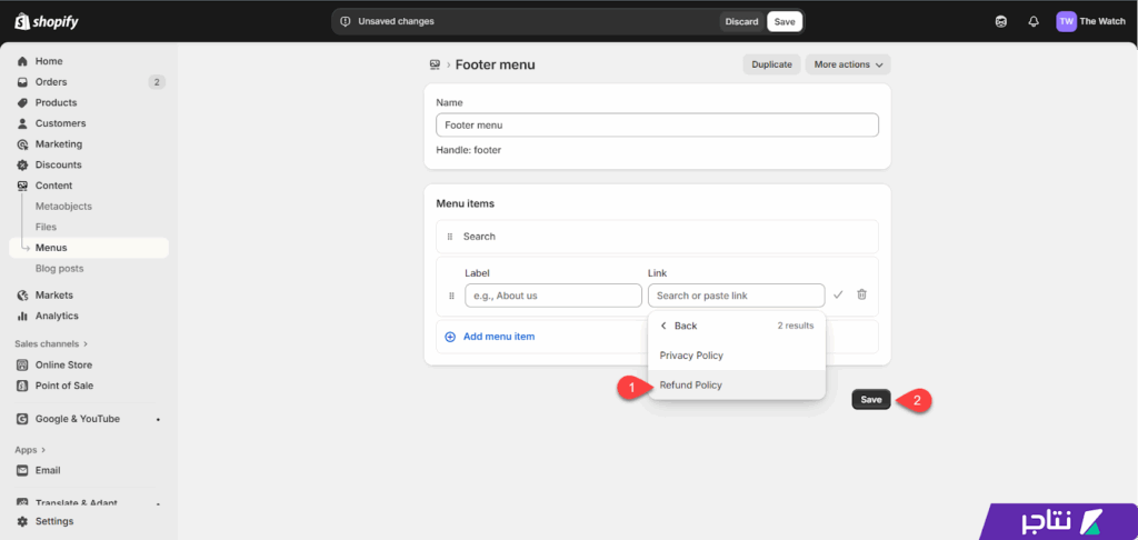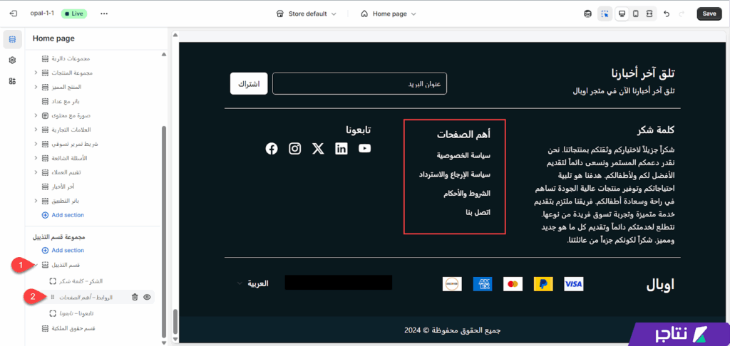 الخطوة التالية هي الانتقال إلى إعدادات تخصيص القالب في المتجر، ثم إلى قسم التذييل (Footer) وإضافة القائمة التي أعددتها في الموضع المناسب لتظهر ضمن أهم صفحات المتجر كما هو موضح في الصورة التالية: