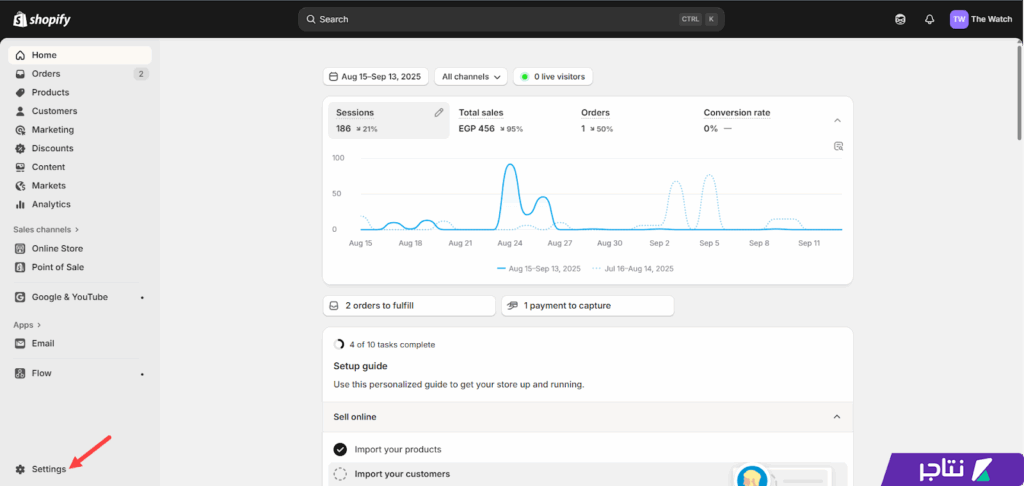 في البداية، نتوجه إلى إعدادات متجر شوبيفاي الرئيسية عبر الضغط على زر "Settings" من القائمة الجانبية.