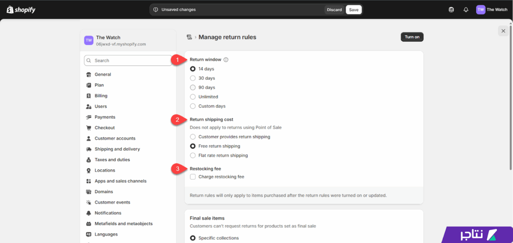 - Return window: حدد فترة السماحية لاسترجاع المنتجات في المتجر، على سبيل المثال 14 يومًا.