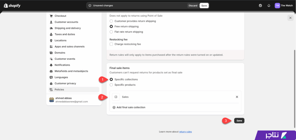 لذلك انتقلت إلى قسم Final sale items، ثم اخترت خيار Specific collections وحددت التصنيف المطلوب من المتجر.