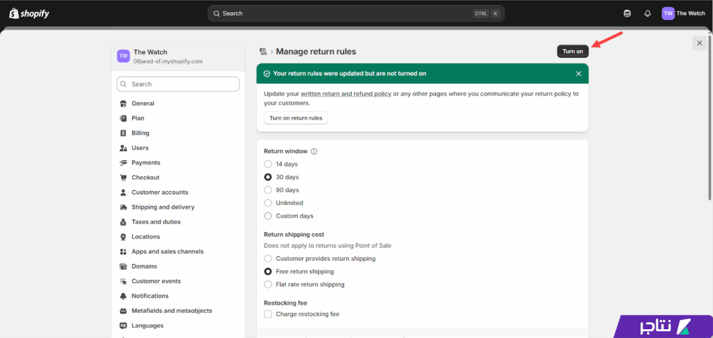 ثم ضغطت على زر "Turn On" لتفعيل معايير سياسة الاسترجاع وتطبيقها على المتجر.