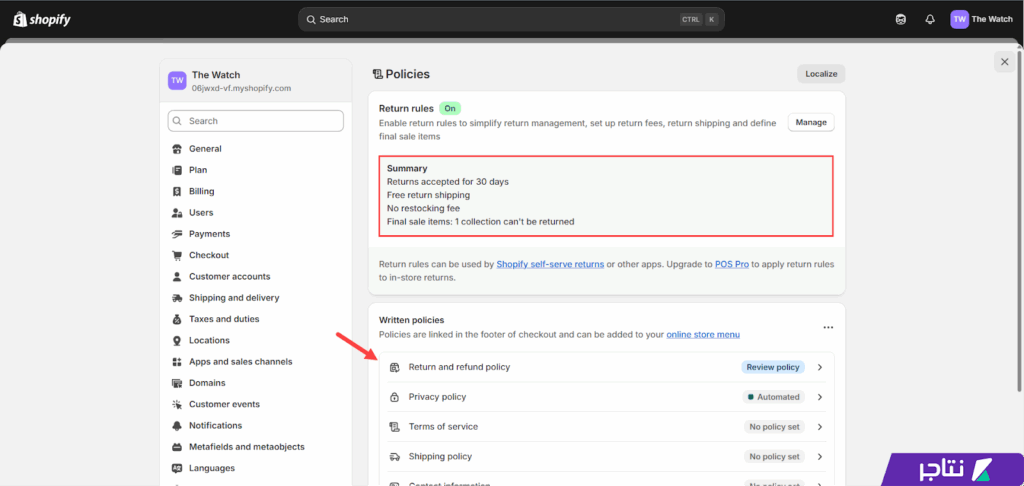 بعد ضبط شروط سياسة الإرجاع والاسترداد على المتجر، نعود مرة أخرى إلى قسم سياسات المتجر، حيث ستلاحظ ظهور ملخص عن سياسة الإرجاع والاسترداد في الجزء العلوي.