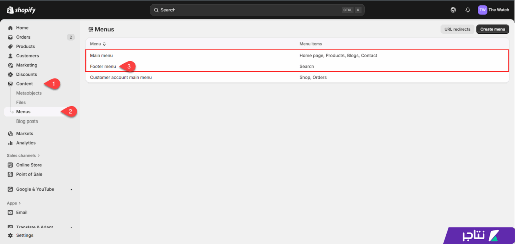 للقيام بذلك، نتوجه أولًا إلى تبويب "Content" من القائمة الجانبية في شوبيفاي، ثم نختار منه "Menus". بعد ذلك سيتم توجيهك إلى لوحة إدارة القوائم. اختر القائمة المناسبة، مثل قائمة الفوتر (Footer Menu) كما يظهر في الصورة التالية: