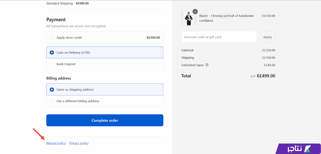 الآن ستجد أن شوبيفاي يضيف سياسة الإرجاع والاسترداد تلقائيًا في صفحات المتجر بالمواضع المناسبة. فعلى سبيل المثال، ستظهر أسفل صفحة إتمام الدفع كما هو موضح في الصورة التالية: