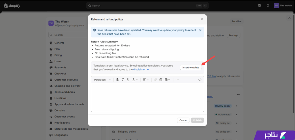 يمكنك إما كتابة سياسة الاسترجاع يدويًا، أو استخدام النموذج الجاهز الذي يوفره شوبيفاي عبر الضغط على زر "Insert template"، ليتم إنشاء سياسة استرجاع تلقائيًا وفقًا للشروط التي تم تجهيزها في الخطوات السابقة.