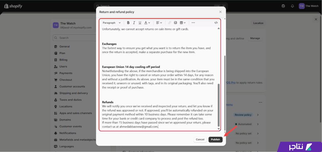 وأخيرًا، اضغط على زر "Publish" لنشر صفحة سياسة الاسترجاع على المتجر.