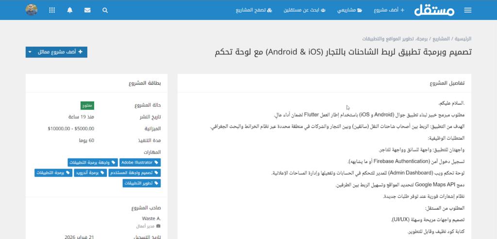 يمكنك الاستفادة من منصات العمل الحر في البحث عن المبرمجين المناسبين مثل منصة مستقل، حيث تضم عددًا كبيرًا من المبرمجين بمستويات خبرة متفاوتة. ابدأ بنشر مشروعك على المنصة مع توضيح جميع تفاصيل التطبيق بدقة، من حيث الوظائف والمزايا وآلية التعاقد والتسليم، والخبرات المطلوبة، والميزانية المتاحة، ومدة التنفيذ، ثم استقبل العروض وقيّمها بعناية.