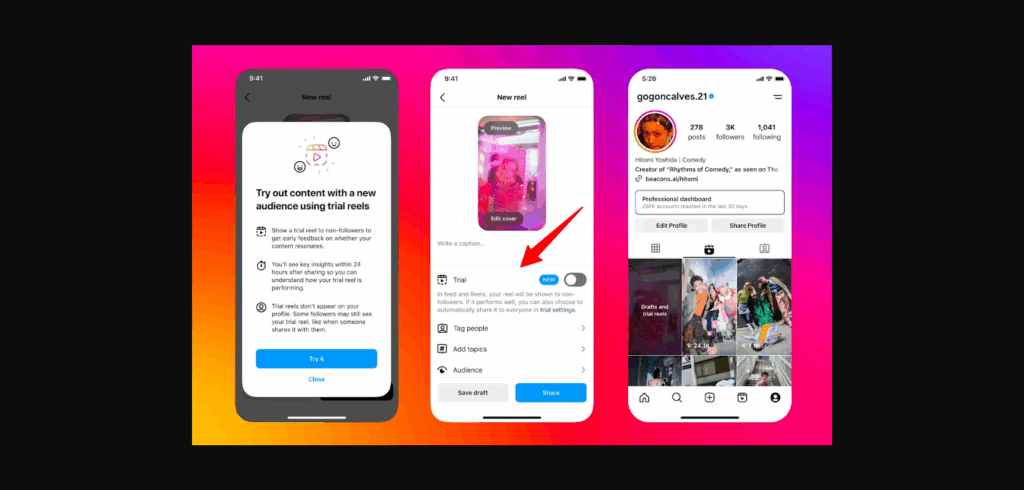 فإن كان لديك صديقي العزيز بعض الأفكار الاستثنائية الجديدة، يمكنك تجربتها الآن ونشرها على الريلز التجريبية ومن بعدها تقرر إن كنت ستنشرها لمتابعينك أم لا.