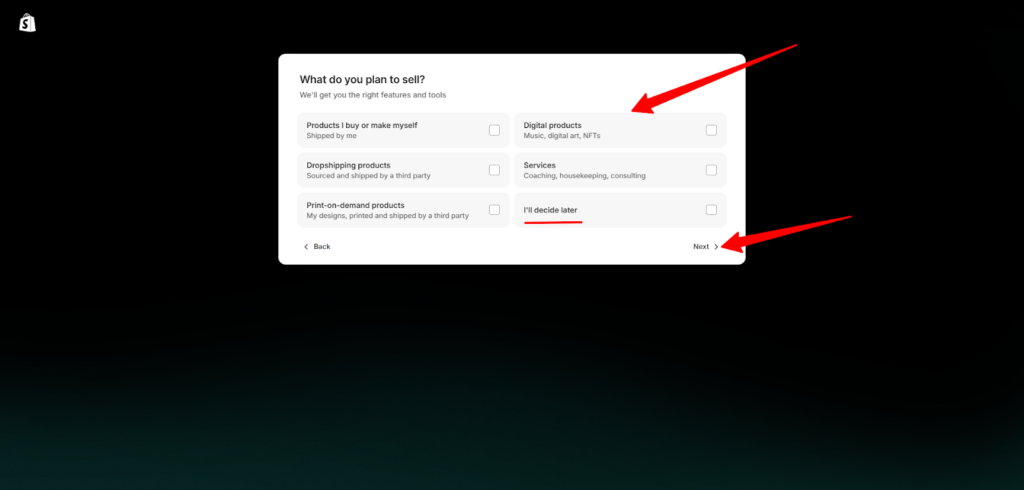 - سيسألك شوبيفاي الآن عن منتجاتك التي ستبيعها على متجرك، بالنسبة لي، ليس لدي أي منتجات سوا خدماتي الرقمية حقيقةً، ولكن أشعر أن يمكنني في المستقبل تغيير ذلك، لذا سوف أختار خيار" سأقرر لاحقًا". ومن ثم أضغط على "التالي".