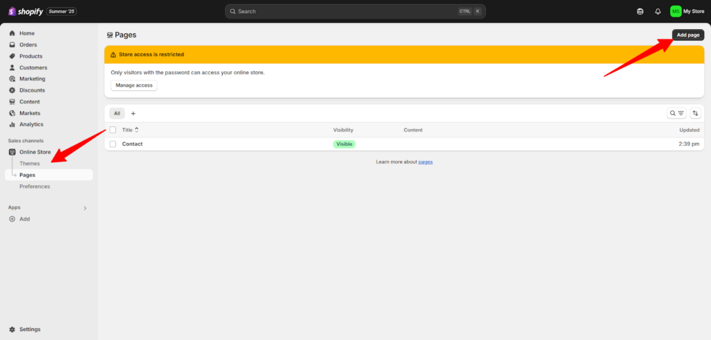 - ننتقل الآن إلى إضافة صفحاتك المطلوبة.. لن يوفر لك القالب كل الصفحات التي تناسبك، فيمكنك حذف وأغضافة الصفحات حسب مشروعك وتفاصيله، لذ اتبعني لكي نضف الصفحات.. من القائمة على اليسار اختر "Online store" ومنه اختر "Pages".