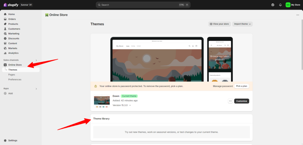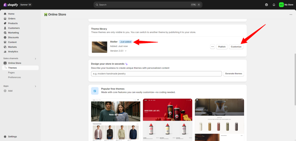 - بعد إتمام تحميل القالب إلى متجرك سوف تجده في لوحة التحكم، يمكنك حينها اختيار "تخصيص" أو "Customize" لتعدل على القالب بما يناسب هويتك ومشروعك.
