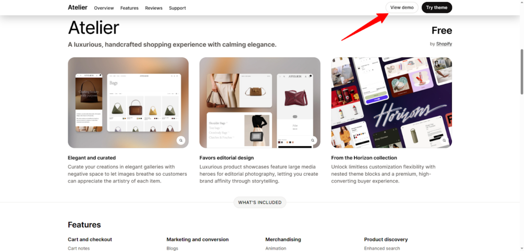- بعد اختيار القالب، اضغط على "view demo" لتستعرض القالب قبل تأكيده، ووقتها تصفح كل جوانب القالب وتفاصيله لتتأكد أنه هو المناسب لك ولمنتجاتك.
