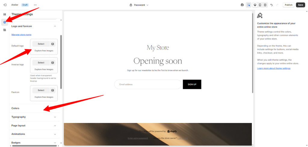 - يمكنك الآن تغيير الهوية البصرية للقالب فيما يتناسب مع هويتك، من القائمة على اليسار اضغط على زر الترس لتعدل إعدادات القالب، ثم اختر العناصر التي ترغب في تعديلها من إضافة الشعار والألوان والخطوط وغيرها من عناصر الهوية البصرية.