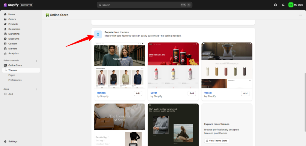 - من قسم "المظهر" في لوحة التحكم، يمكنك اختيار قالب مجاني أو مدفوع من متجر القوالب الخاص بشوبيفاي.