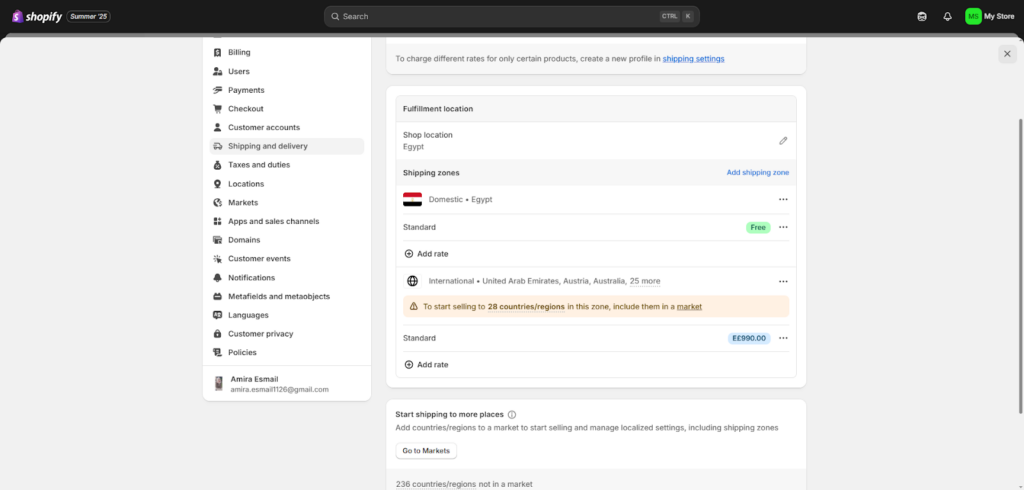 وهذا يعني أنك بحاجة إلى الانتقال إلى إعدادات "Markets" وتفعيل هذه الدول هناك، كي يتمكن عملاؤك من الشراء فعليًا من تلك المناطق.