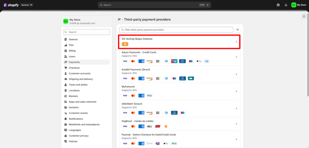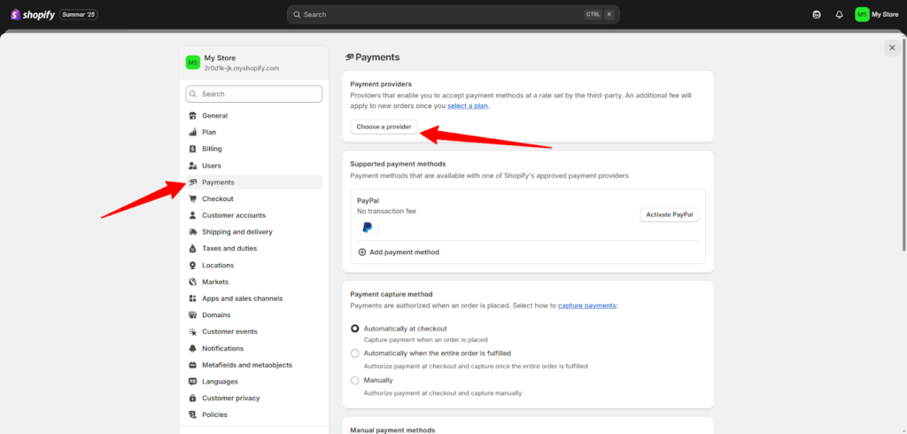 بنفس الطريقة التي وصلت منها إلى الشحن والتوصيل، اختر من القائمة على اليسار قسم المدفوعات، ومن قسم "المدفوعات"، فعّل بوابات الدفع المناسبة، مثل الدفع بالبطاقة، باي بال، أو حتى الدفع عند الاستلام إن كنت تستهدف جمهورًا محليًا.