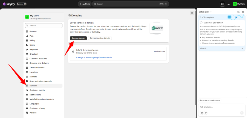 - ادخل إلى قسم "النطاقات"، واشترِ دومينًا خاصًا بك مثل: mybrand.com. يمكنك شراء الدومين مباشرة من شوبيفاي أو ربط دومينك الحالي بسهولة. هكذا تبدو أكثر احترافية وتكسب ثقة العملاء من أول نظرة!