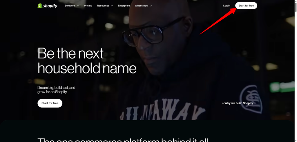 ادخل إلى موقع Shopify واضغط على زر "ابدأ تجربتك المجانية" أو "Start for free"، نعم، المنصة توفر لك فترة تجريبية دوندفع، لتستكشف وتتعلم قبل أن تُحمّل نفسك أي التزامات.